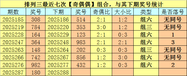 开奖回顾:排列三第2025287期开奖号码为:180。奖号类型为:组六,大小类型为:小大小,奇偶类型为:奇偶偶,包含重号:1。