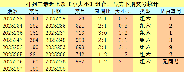 大小分析:排列三上期开出号码180,大小类型为【小大小】,最近七次开出大小类型小大小的奖号分别为:164、282、151、364、190、281、150,其下期分别开出号码:123、321、713、983、693、742、982。其中号码大小比为8:13,大号开出比例较低,本期适当关注大号回补,预计开出2个大号。