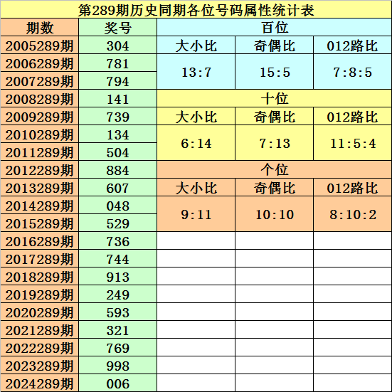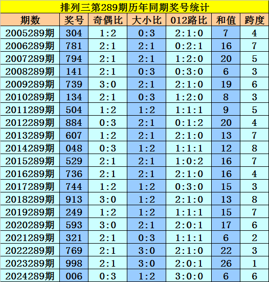 开奖回顾:排列三第2025288期开出奖号504,奖号012路比为1:1:1,大小比为1:2,奇偶比为1:2,最近三年第289期同期开出奖号为:第2022289期:769、第2023289期:998、第2024289期:006。
