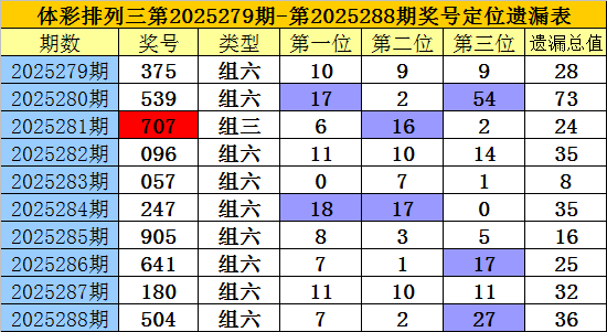 开奖回顾:排列三第2025288期奖号为:504,各位号码遗漏值分别为7、2、27,遗漏总值为36。