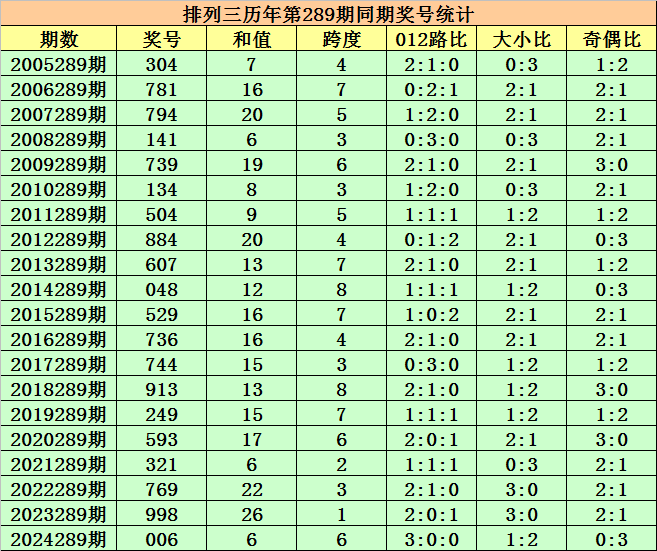历史上第2025289期排列三已开出20期奖号了,历年同期奖号分别为:304、781、794、141、739、134、504、884、607、048、529、736、744、913、249、593、321、769、998、006,详细统计见下表: