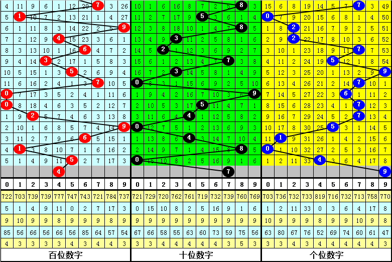 十位:上期为0,近10期012路比为5:3:2,其中0路号遗漏2期出现,本期排除0路号,注意1路号出现,关注7。