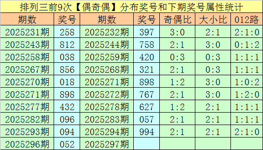 上期回顾:排列三第2025296期开出奖号052,类型为:偶奇偶、022路和小大小。