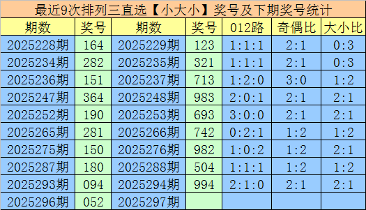 上期回顾:排列三第2025296期奖号为052,组六,大小比开出1:2,直选分布为:小大小。