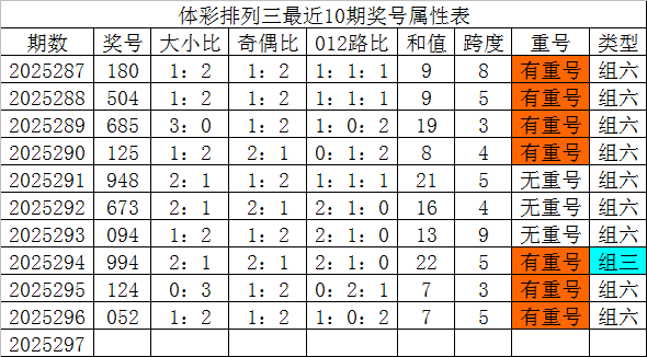 体彩排列三最近10期分别开出奖号:180、504、685、125、948、673、094、994、124、052,各奖号属性详见下表: