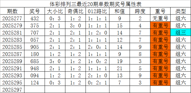 体彩排列三最近20期单数期奖号分别为:432、375、707、057、905、180、685、948、094、124,各期奖号详细属性下表: