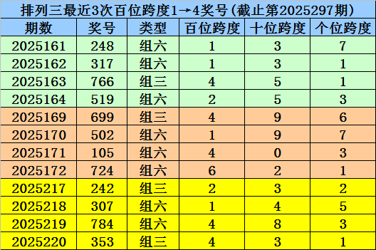 第2025217-第2025219期奖号:242、307、784,其下期奖号为:353,首位号码跨度为4;