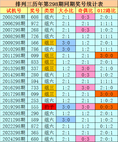 012路分析:历史上排列三第298期同期奖号中,012路奖号总个数比为30:7:23,012路奖号轮空期数比为2:13:4,今年第298期预计2路号码走冷轮空,看好012路比开出2:1:0。