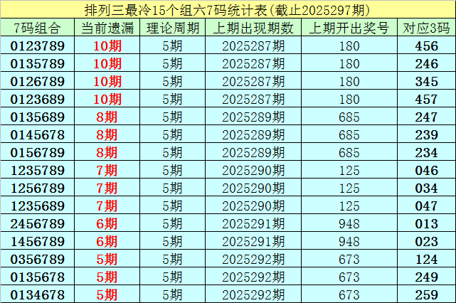 (1)在排列三已开出的7421期奖号中(统计截止第2025297期),目前7码组六遗漏值最大的组合为:0123789、0135789、0126789、0123689,本期遗漏10期;