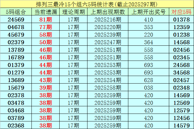 (4)排列三第2025297期遗漏值最大的十个5码组六组合解冻了0个;