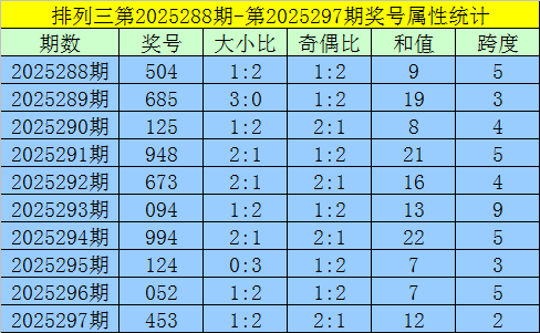 上期回顾:排列三第2025297期出现奖号453。开出组六,奇偶比2:1,012路比1:1:1,大小比1:2,和值12,跨度2。