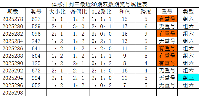 体彩排列三最近20期双数期奖号分别为:627、539、096、247、641、504、125、673、994、052,各期奖号详细属性下表: