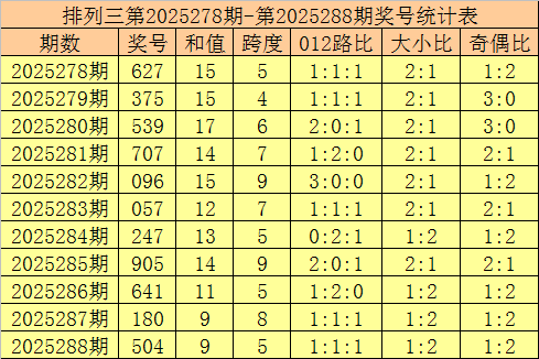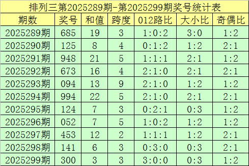 开奖回顾:排列三第2025299期奖号开出:300,组选类型:组三,大小比为0:3,奇偶比为1:2,和值为3,跨度为3。