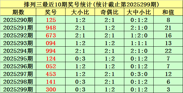 上期回顾:排列三第2025299期奖号为:300。奖号类型:组三,和值:3,奇偶比:1:2,跨度:3,大小比:0:3。