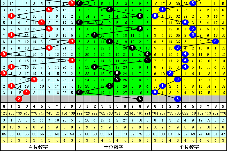 大中小分析:在组选0-9号码分布图中,前10期小 号(0-2区段)出现11枚奖号,中号(3-6区段)出现13枚奖号,大号(7-9区段)出现6枚奖号,上期大号区域轮空,本期预计大中小区域各出1枚奖号。