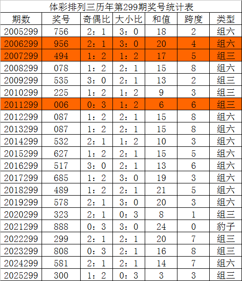 排列三第2025299期奖号为300,奇偶比为1:2,大小比为0:3,和值为3,跨度为3。