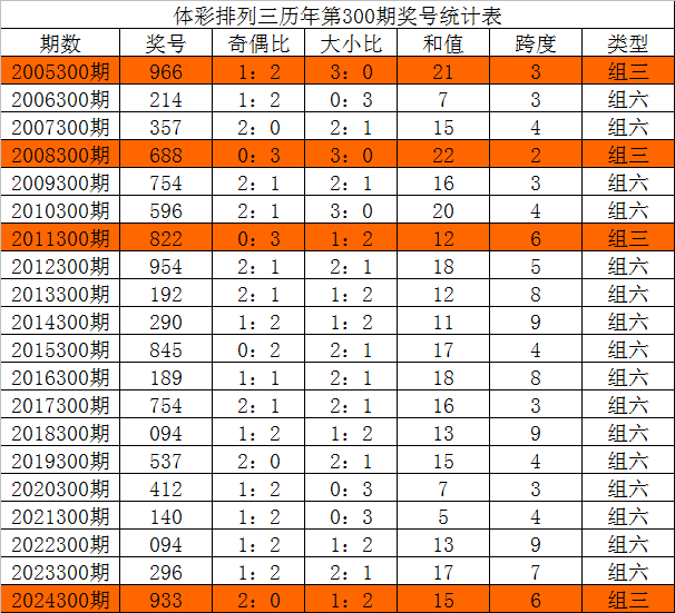 体彩排列三历年第300期开出奖号分别为:966、214、357、688、754、596、822、954、192、290、845、189、754、094、537、412、140、094、296、933。统计详见下表:
