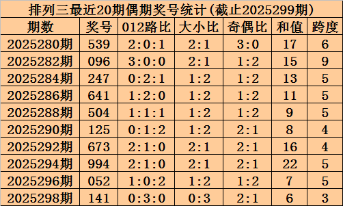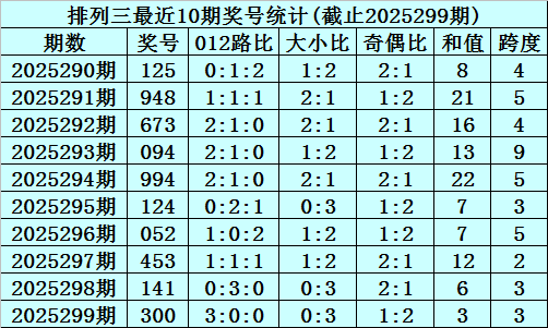 上期回顾:排列三2025299期奖号为300,奇偶比为1:2,大小比为0:3,跨度为3。