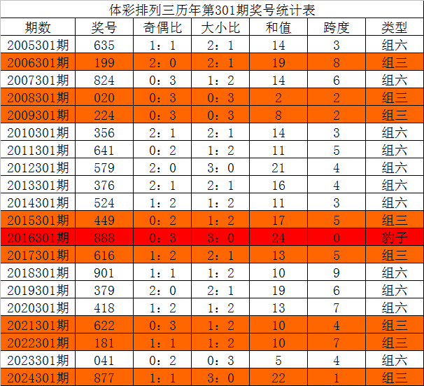 体彩排列三历年第301期开出奖号分别为:635、199、824、020、224、356、641、579、376、524、449、888、616、901、379、418、622、181、041、877。统计详见下表: