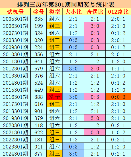 组选类型推荐:历史上排列三第301期同期奖号中,组六出现11期,组三出现8次,豹子出现1期,今年第301期预计奖号为组六号码。