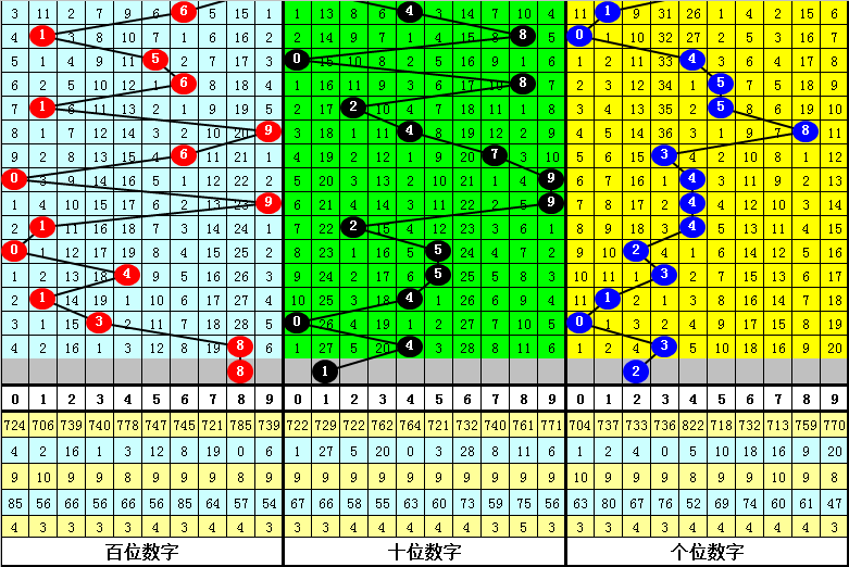 号码个数分析:历史上排列三第301期同期奖号中,号码0-9出现个数分别为:号码0、3、5开出4个,号码7开出5个,号码9开出6个,号码2、6、8开出7个,号码1、4开出8个,今年第301期排除号码0。