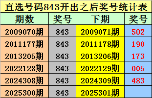 排列三直选843出现之后下期奖号分别为:502-190-173-005-483。