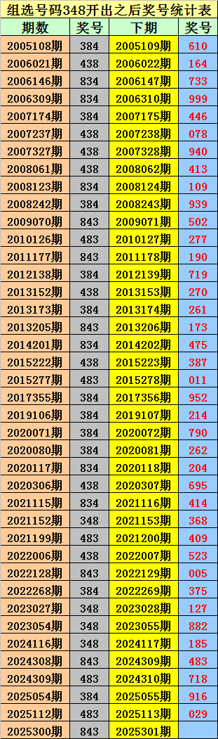 排列三组选348出现之后下期分别开出:610、164、733、999、446、078、940、413、109、939、502、277、190、719、270、261、173、475、387、011、952、214、790、262、204、695、414、368、409、523、005、375、127、882、185、483、718、916、029。