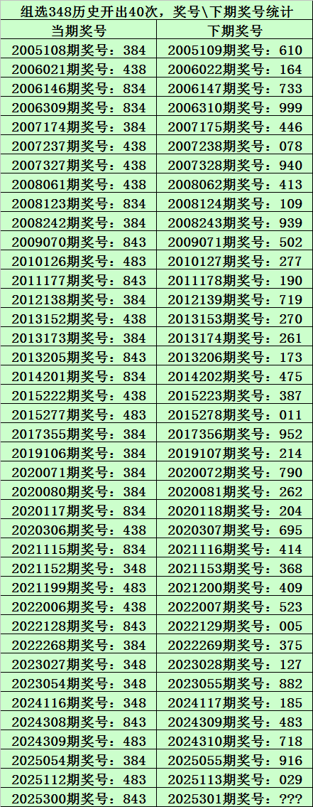 二、组选348分析:排列三历史上已开出40次组选号码348了,其奖号和下期开出奖号统计如下: