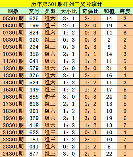历年第301期奖号中:豹子开出1次,组三开出8次,组六开出11次。组三、组六基本相当,本期关注组六。