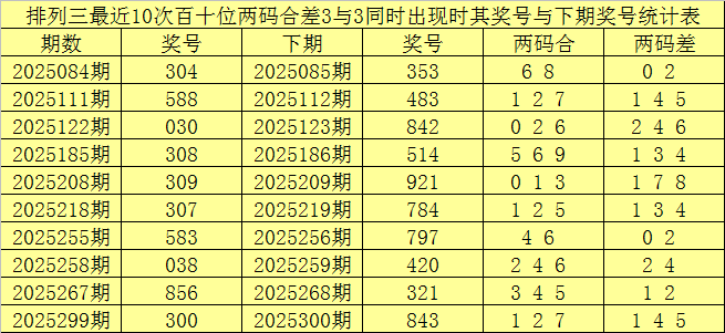 百个位合差分析:上期奖号百个位开出52组合,两码合为7,两码差为3,最近10次百个位两码合7与两码差3同时出现时,其奖号和下期奖号分别为: