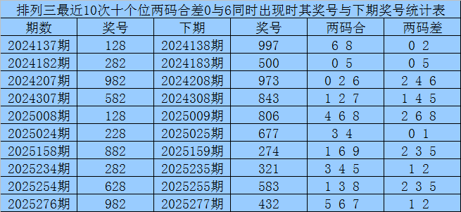 从以上统计可以看出,十个位两码合差0与6同时出现之后其下期两码合差表现最热的4个分别为:1256,本期十个位两码合差可以参考这四码中的数据。