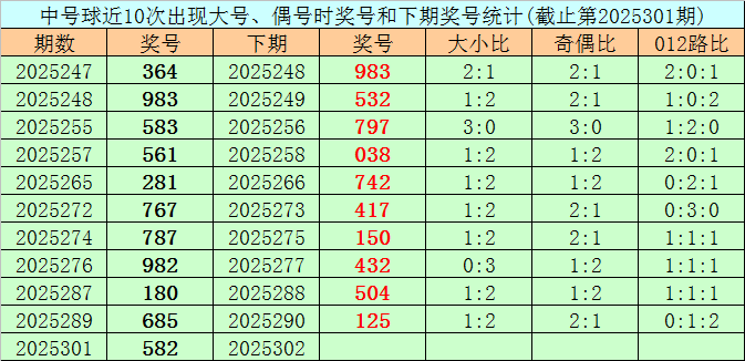在中号球前10次开出大号、偶号类型之后,其下期分别开出奖号:983、532、797、038、742、417、150、432、504、125,其中号码012路比为5:2:3,奇偶比为6:4,大小比为3:7。