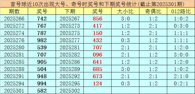 在首号球前10次开出大号、奇号类型之后,其下期分别开出奖号:856、417、150、432、707、096、641、685、673、124,其中号码012路比为4:5:1,奇偶比为3:7,大小比为5:5。