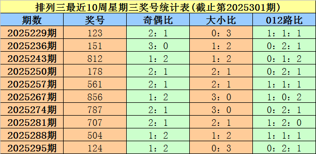 上期回顾:排列三第2025301期奖号为582。其中奖号奇偶比为1:2,大小比为2:1,012路比为0:0:3。