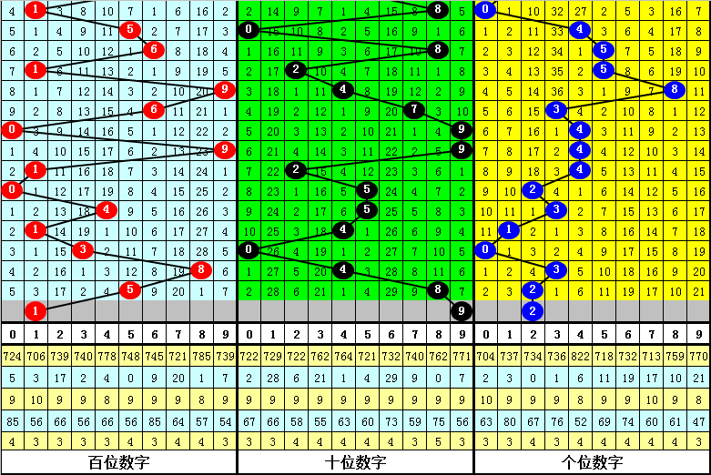 百位号码:前50期走势活跃的号码为:1、5开出7个,0、6开出6个;走势最冷的号码为:2、3开出3个,4、9开出4个。奖号012路比开出19:16:15,奇偶比开出26:24。本期百位杀排除:7、8,注意号码0、1、4,胆码参考1。