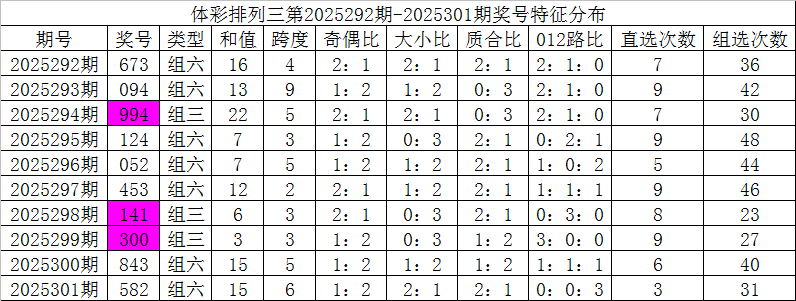 开奖公告:体彩排列三第2025301期开出奖号:582。组六,有重号:8,奇偶比1:2,大小比2:1,012比0:0:3,和值15,跨度6。