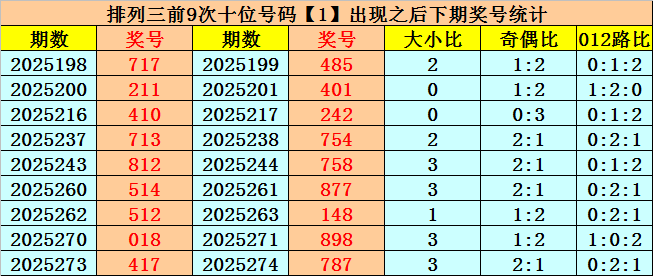 在十位前9次出现号码1后,其下期奖号分别开出:8-0-4-5-5-7-4-9-8,其中奖号个数奇偶比是4:5,大小比是6:3,012路比是2:3:4。