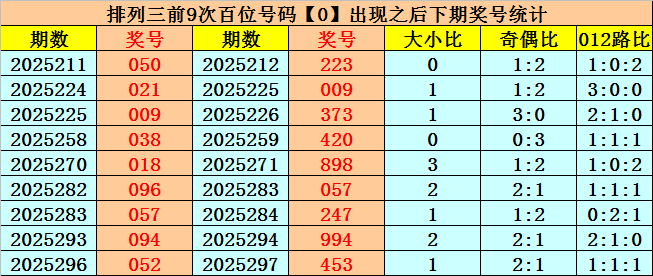在百位前9次出现号码0之后,下期百位分别开出奖号:2-0-3-4-8-0-2-9-4,其中开出号码个数012路比是4:2:3,奇偶比是2:7,大小比是2:7。