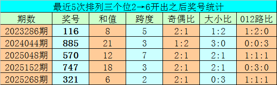 1、排列三前两期个位分别开出号码2和6,历史上个位号码连续两期分别出现2和6时,共有66次。在最近5次出现时,其下期分别出现号码:116、885、570、747、321;