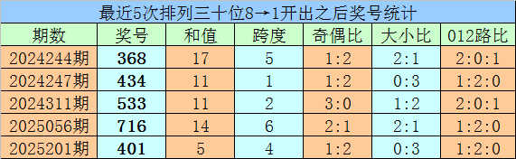 1、最近两期排列三十位号码开出号码分别为8和1,历史上十位号码连续两期同时出现号码8和1的奖号共开出88期。最近五次下期开出号码为:368、434、533、716、401;
