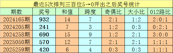1、排列三最近两期百位号码分别开出5和0,历史上百位号码连续两期分别开出5和0的奖号出现了77期。前五期开出之后其下期奖号分别为:932、241、690、570、420;