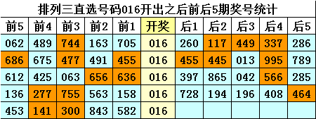 四、排列三直选号码016历史上开出5次,其前后五期奖号分别为:
