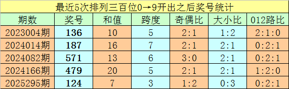 1、排列三最近两期百位号码分别开出0和9,历史上百位号码连续两期分别开出0和9的奖号出现了63期。前五期开出之后其下期奖号分别为:136、187、571、479、124;