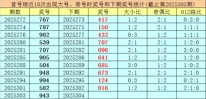 在首号球前10次开出大号、奇号类型之后,其下期分别开出奖号:417、150、432、707、096、641、685、673、124、016,其中号码大小比为4:6,012路比为5:5:0,奇偶比为3:7。