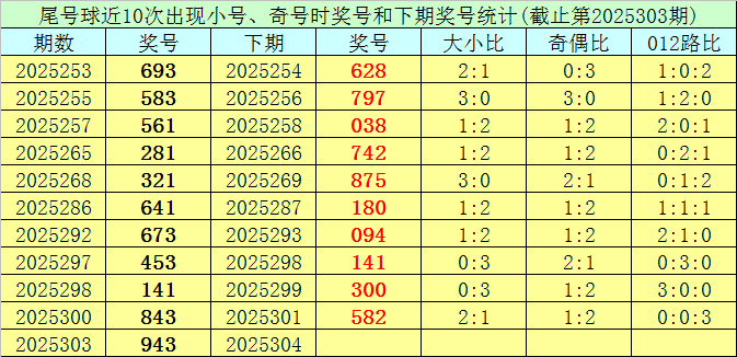 在尾号球前10次开出小 号、奇号类型之后,其下期分别开出奖号:628、797、038、742、875、180、094、141、300、582,其中号码奇偶比为3:7,大小比为4:6,012路比为2:3:5。