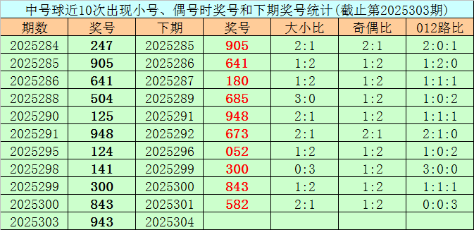 在中号球前10次开出小 号、偶号类型之后,其下期分别开出奖号:905、641、180、685、948、673、052、300、843、582,其中号码大小比为5:5,012路比为2:4:4,奇偶比为2:8。