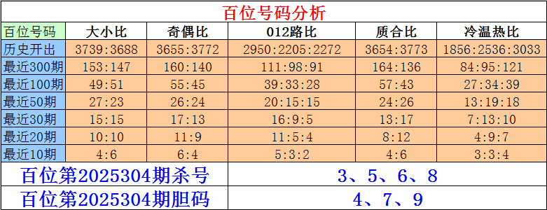 排列三百位第2025304期杀号:3、5、6、8