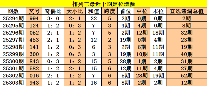 开奖回顾:排列三第2025303期奖号:943,定位直选遗漏值8期、2期、2期,遗漏总值为12期。