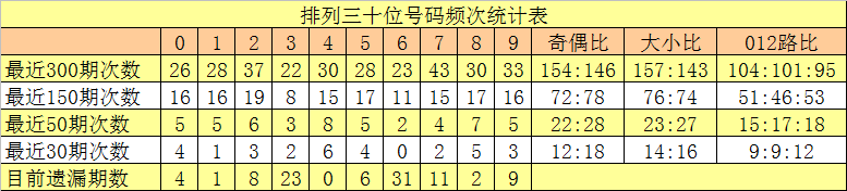 十位号码:前50期走势最活跃的号码为:4开出8个,8开出7个,2开出6个;走势最冷的号码为:6开出2个,3开出3个,7开出4个。十位号码012路比开出15:17:18,大小比开出23:27。本期十位排除两码:3、9,参考号码1、2、4,胆码关注4。