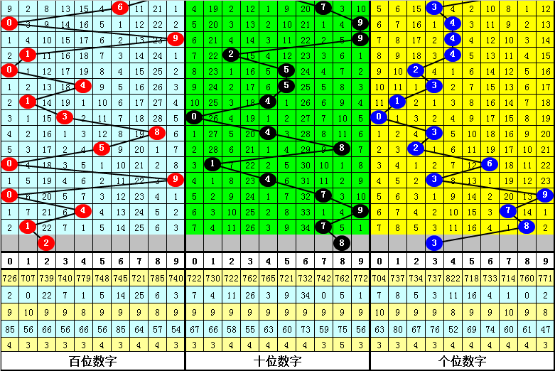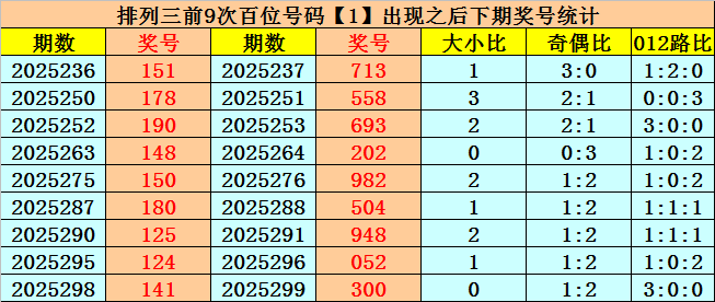 在百位前9次出现号码1之后,下期百位分别开出奖号:7-5-6-2-9-5-9-0-3,其中开出号码个数大小比是6:3,012路比是5:1:3,奇偶比是6:3。